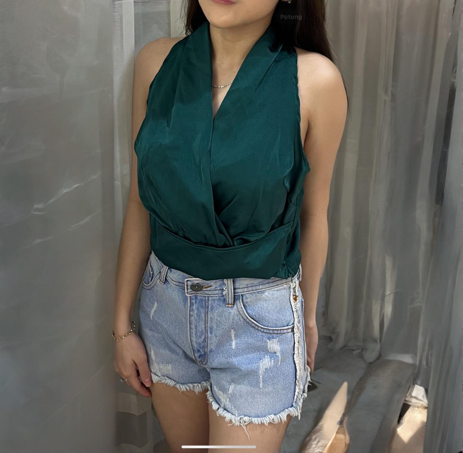 Model Halter Neck & Leher Silang (Wrap/Drapery): Desain leher halter yang mengikat di belakang dipadukan dengan lipatan kain (drapery) elegan di dada, menciptakan tampilan yang seksi namun berkelas.